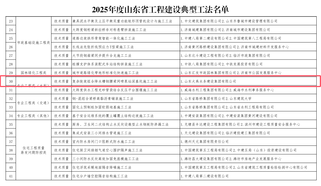 近日,山东省住房和城乡建设厅公布了2025年度山东省工程建设工法名单。集团公司申报的《复杂陡坡组合降水槽钢腰梁网喷泵站深基坑施工工法》《复杂曲形坡面逆序现浇格梗预制混凝土联锁块护坡施工工法》通过评审,获评2025年度山东省工程建设工法,其中《复杂陡坡组合降水槽钢腰梁网喷泵站深基坑施工工法》荣获典型工法。